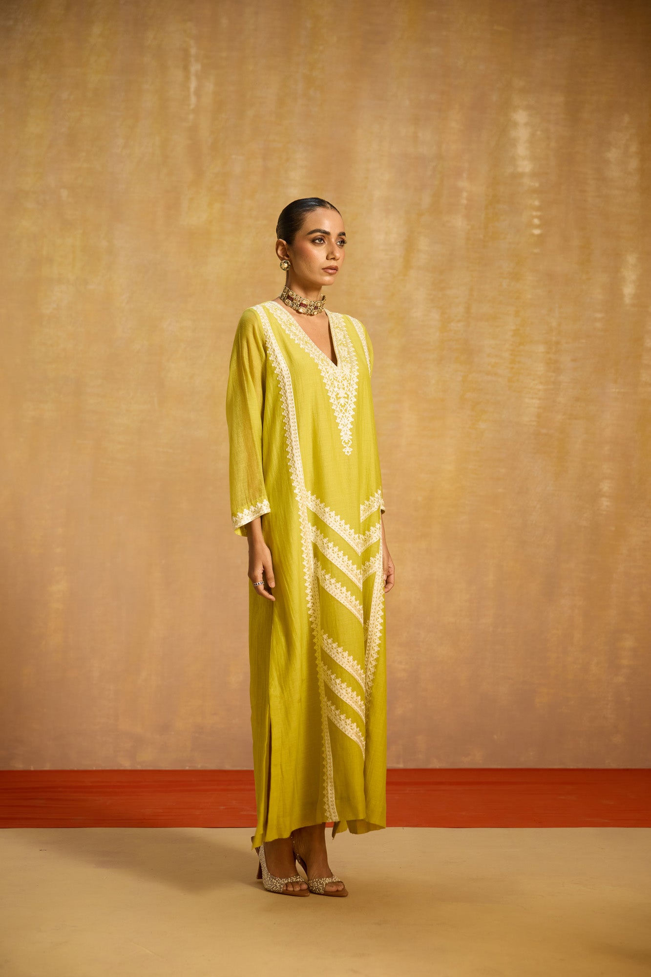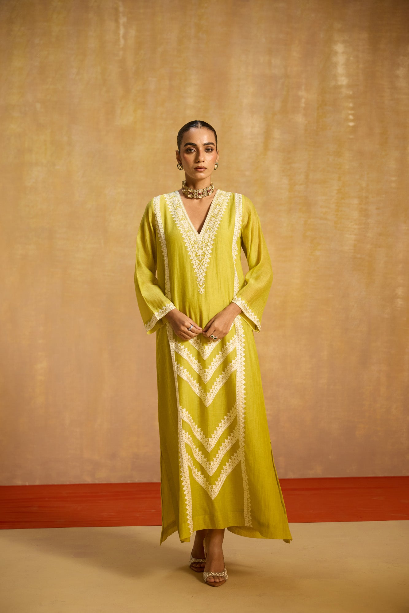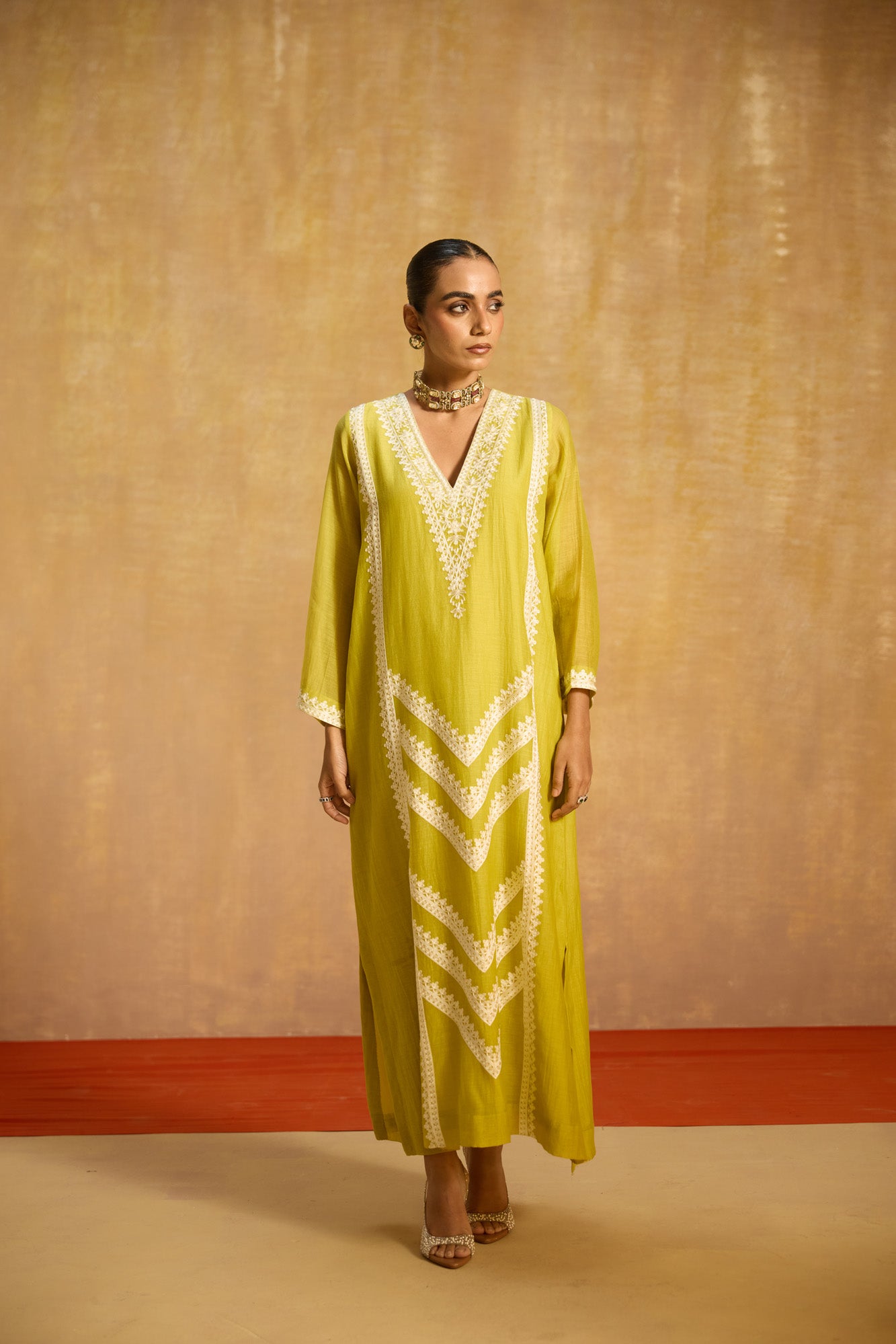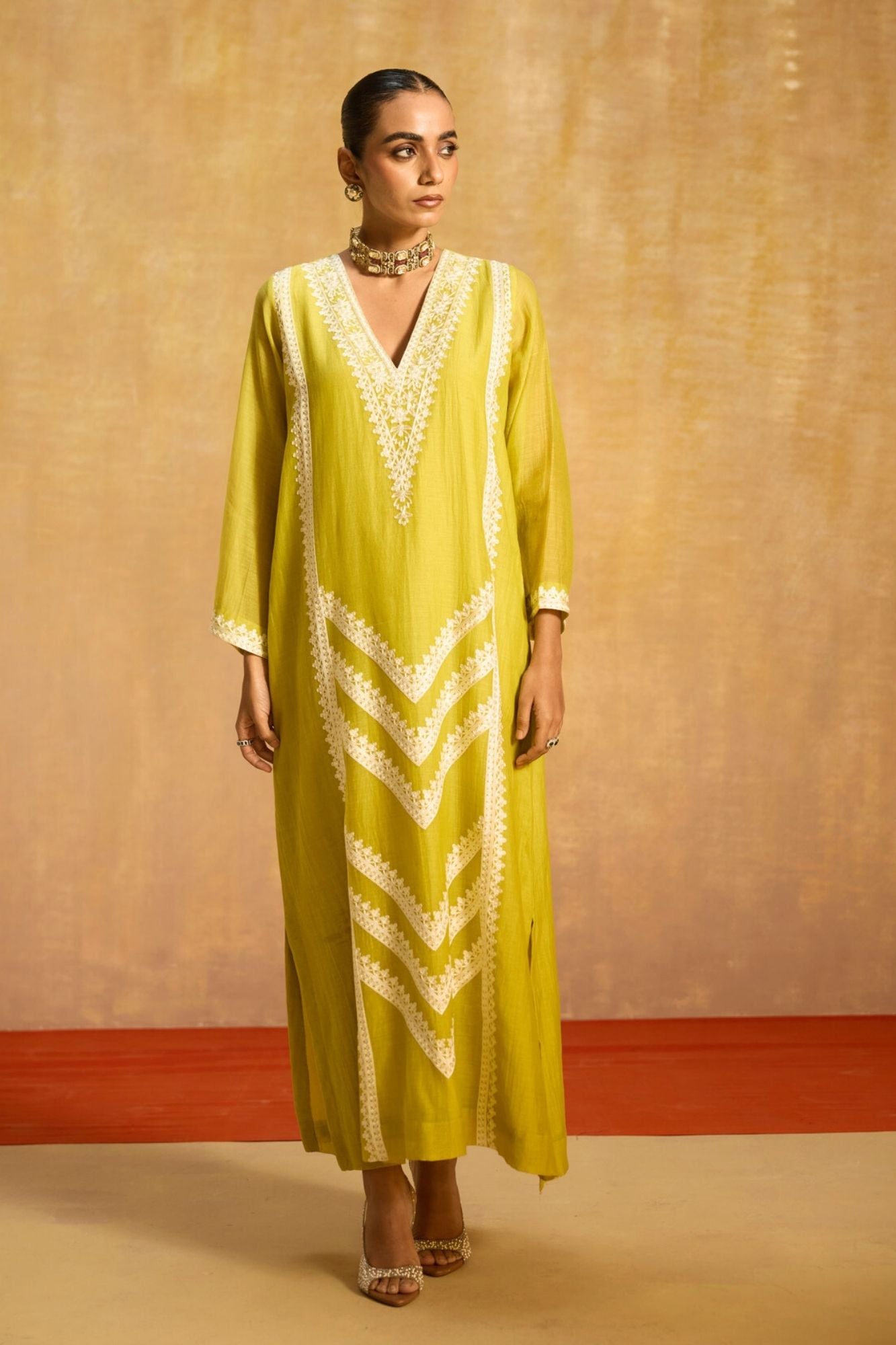 - Adorned with ivory thread embroidery in chevron patterns along the neckline and body for a contemporary yet timeless appeal
