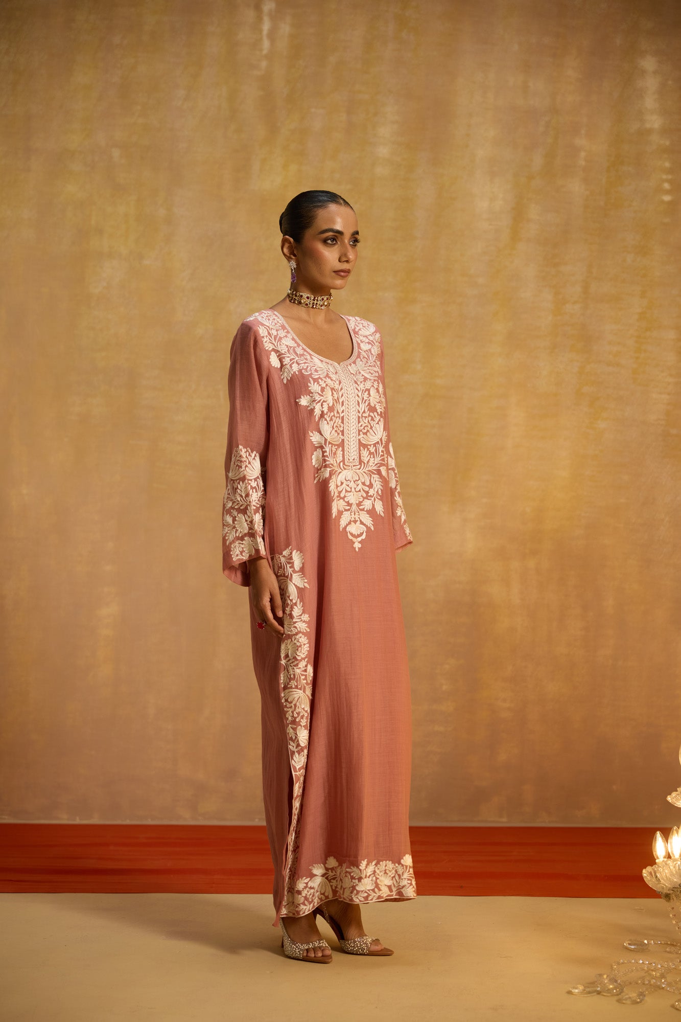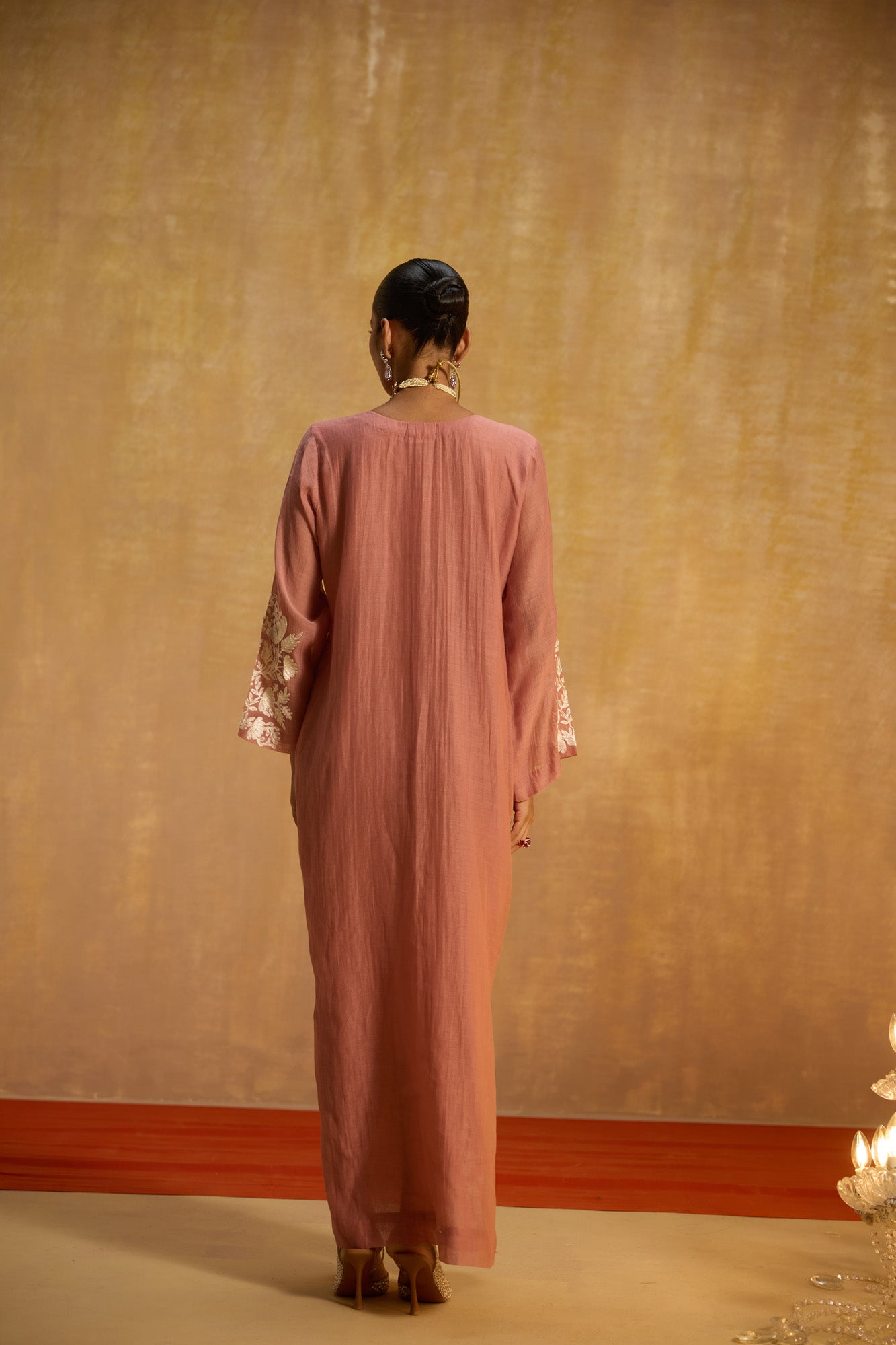 - Longline silhouette with embroidered borders, offering a relaxed yet luxurious aesthetic