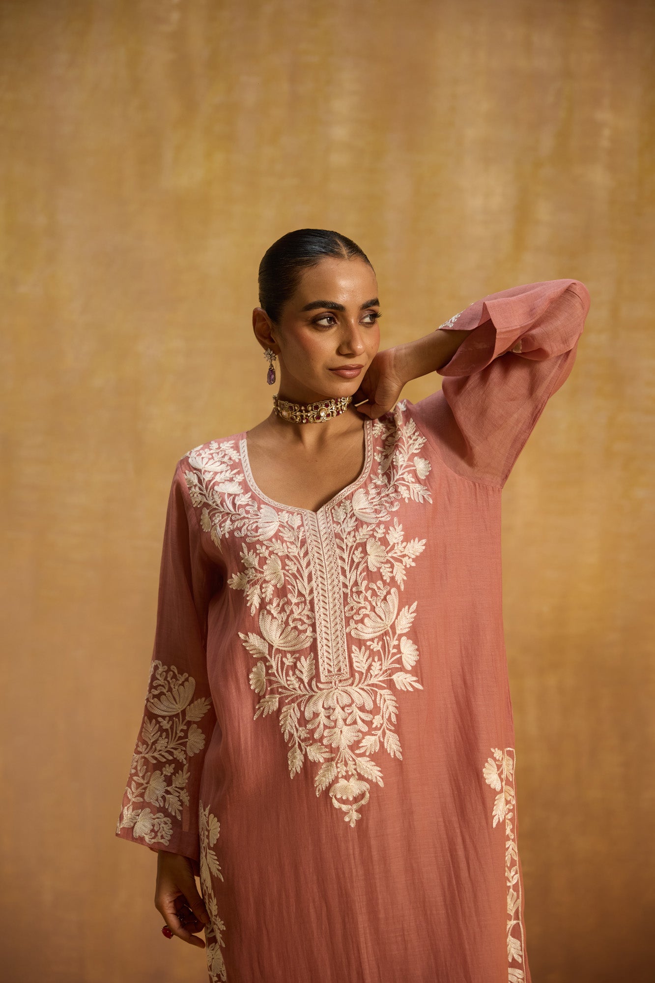 - Round neckline with detailing and full sleeves, combining tradition with sophistication