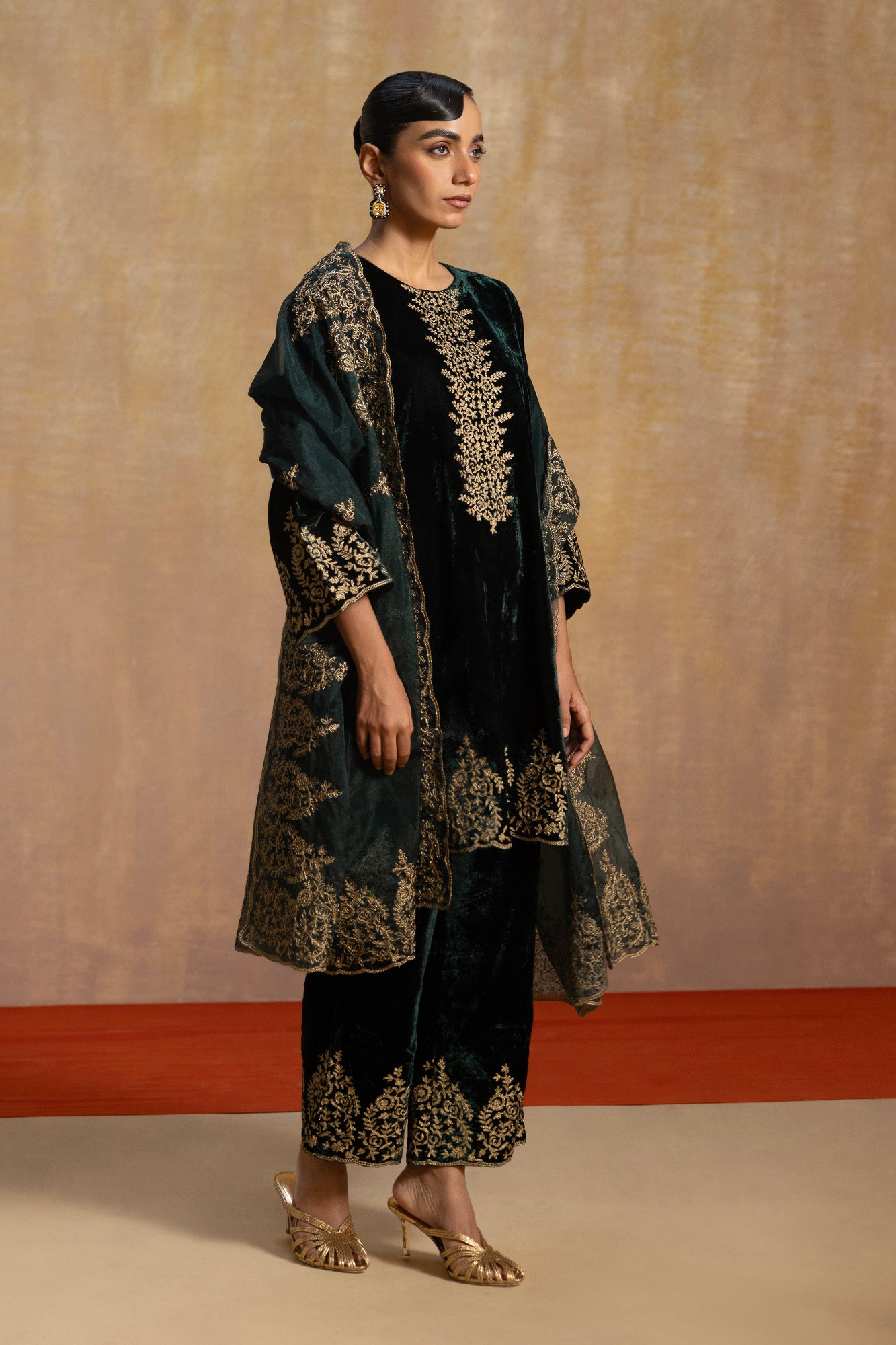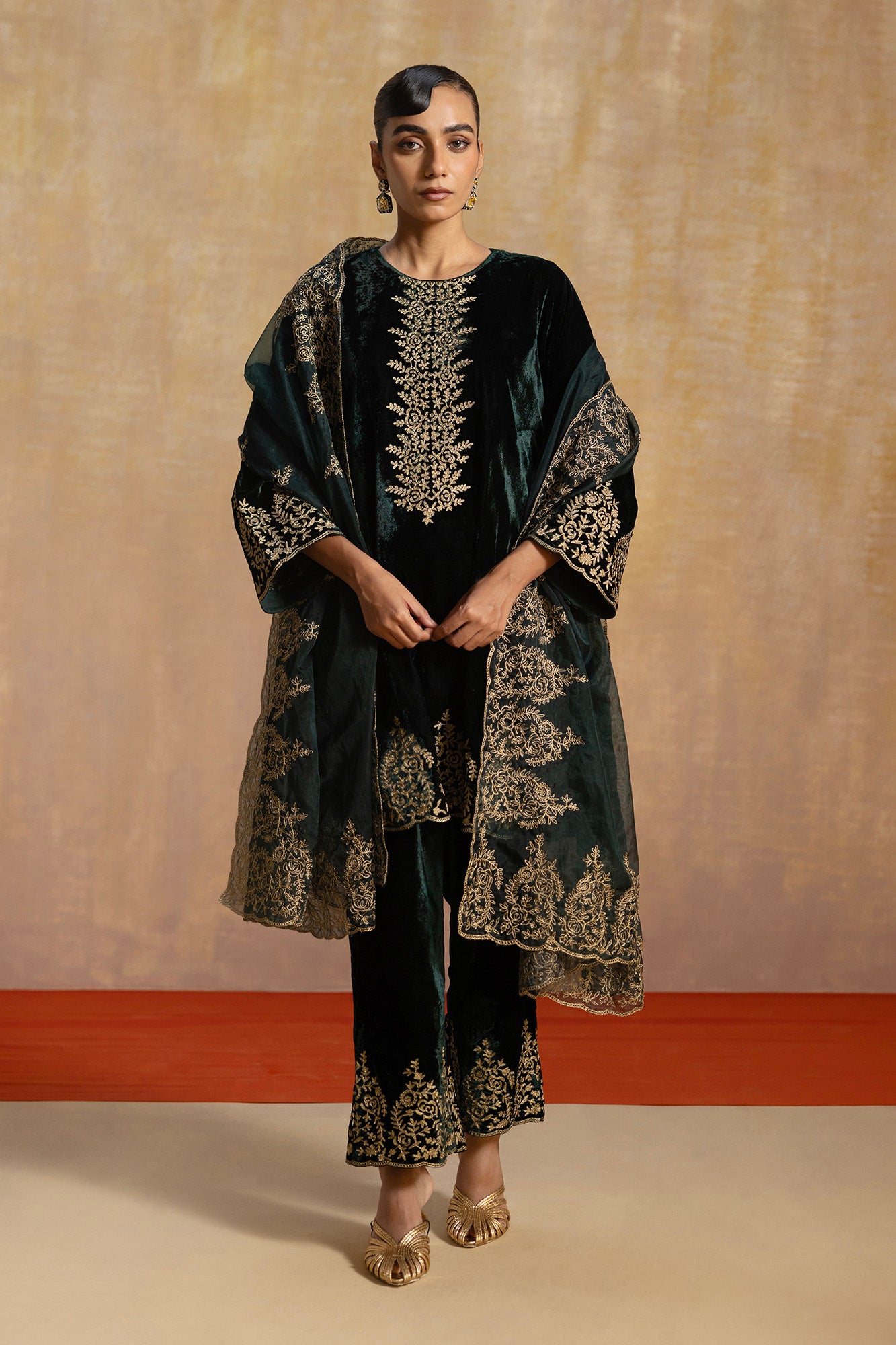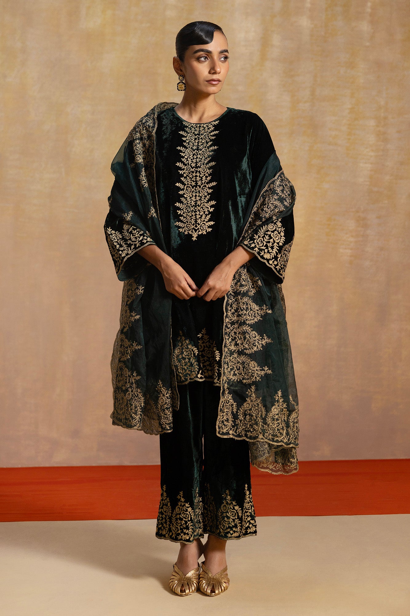 • Highlighted with intricate gold zari and thread embroidery along the neckline, hem, and dupatta for timeless grandeur