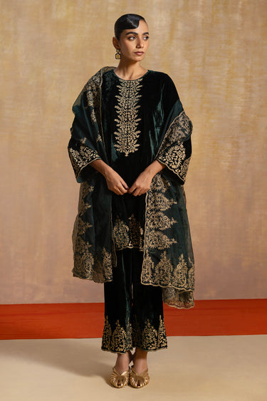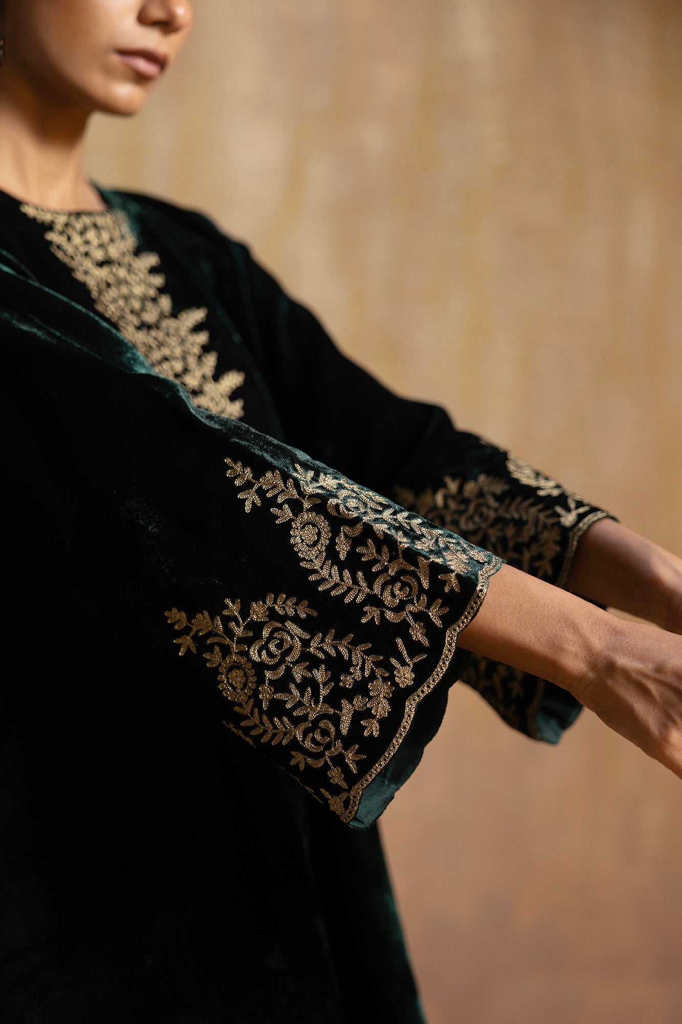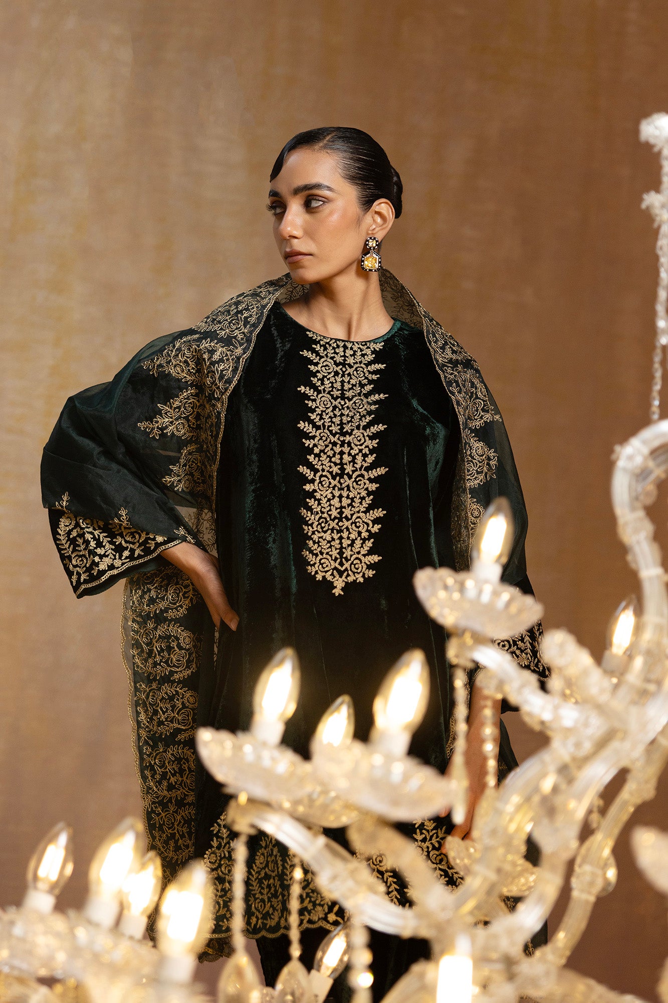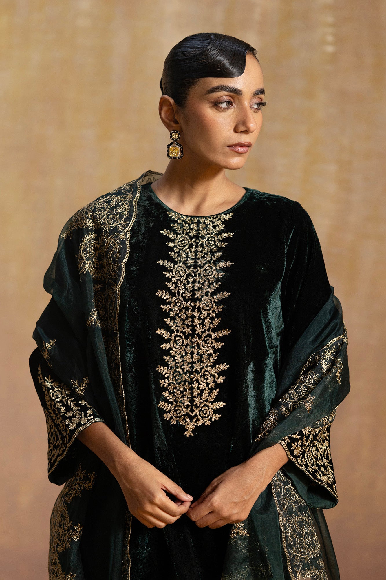 • Crafted from luxurious deep emerald velvet for a rich fall and opulent sheen