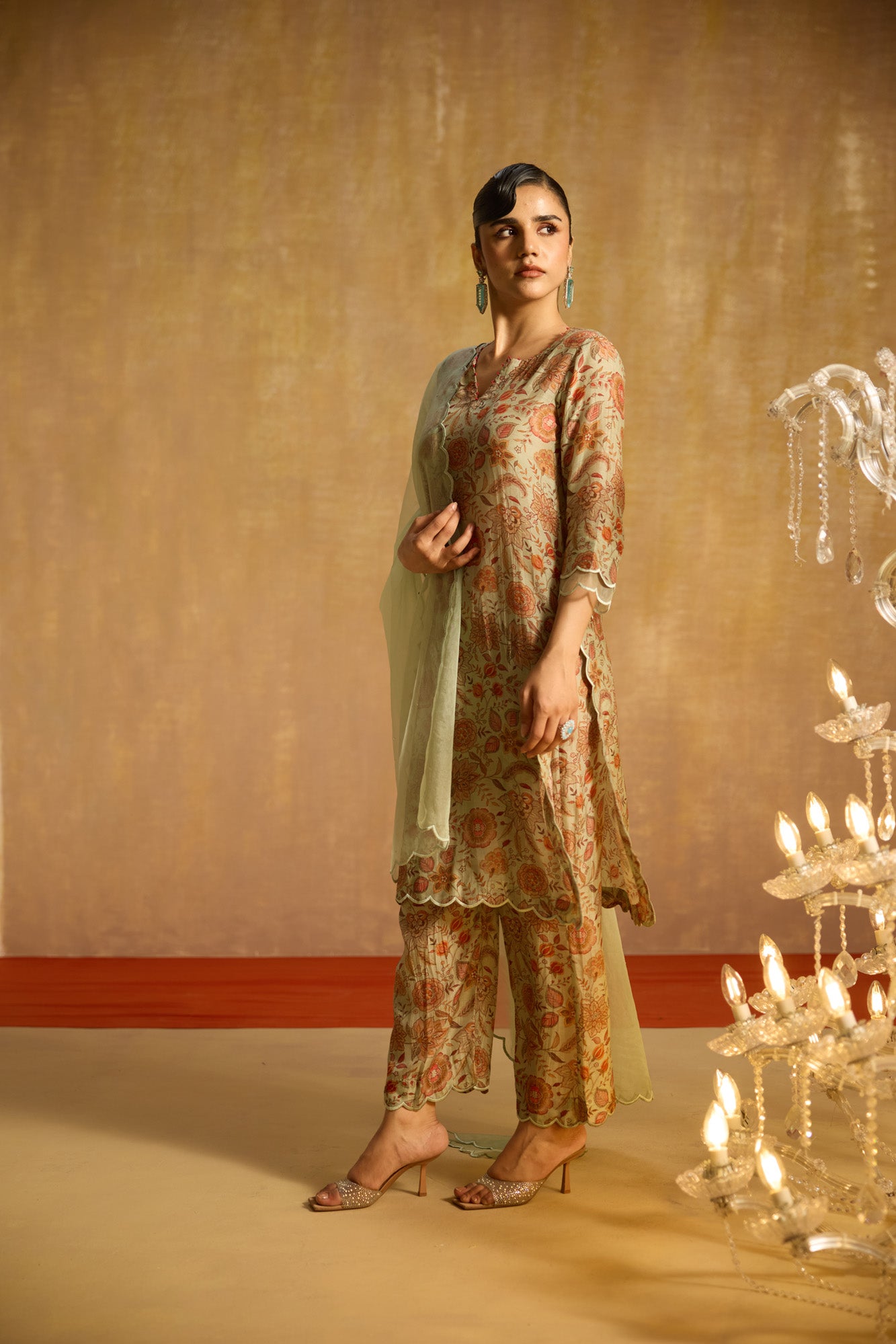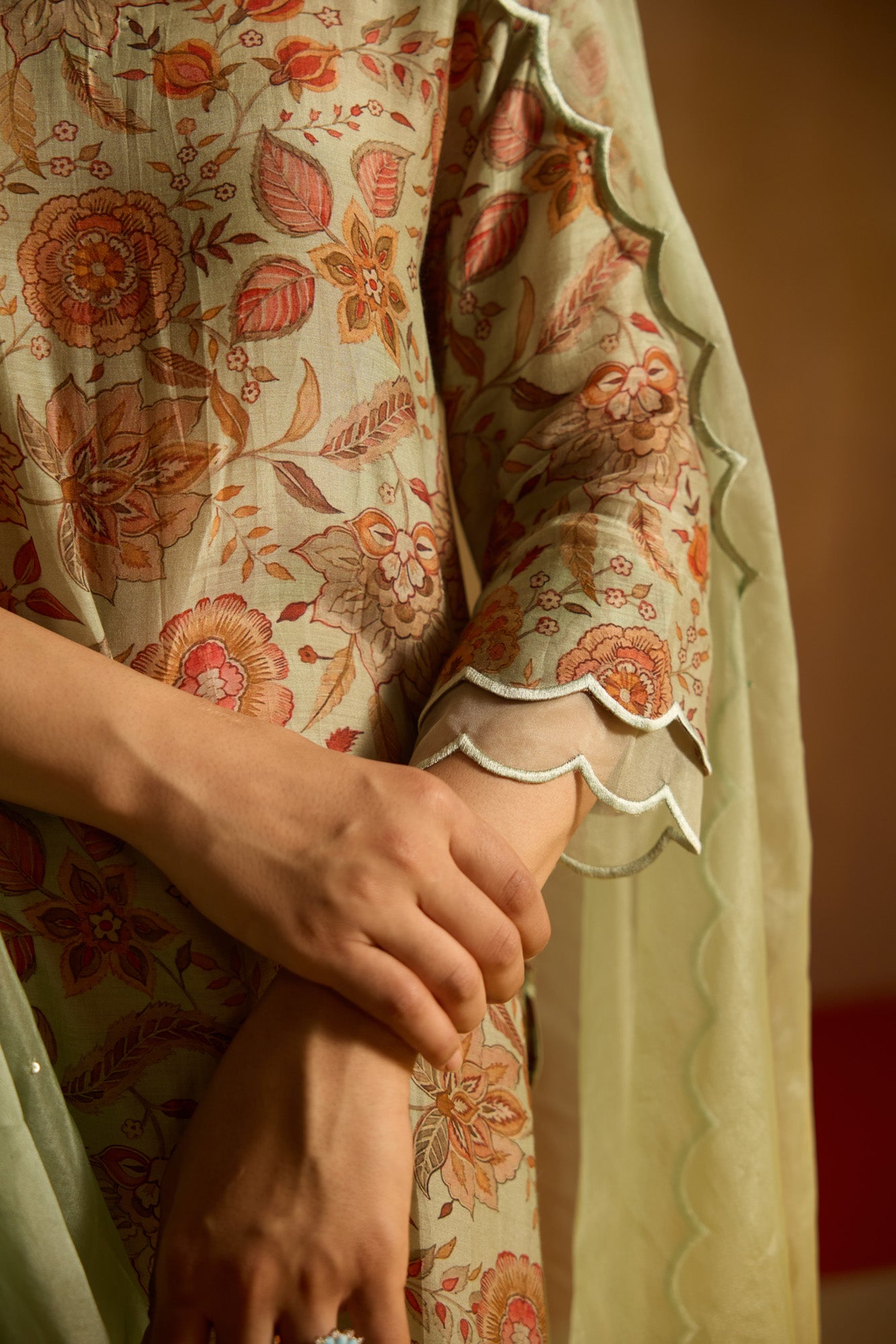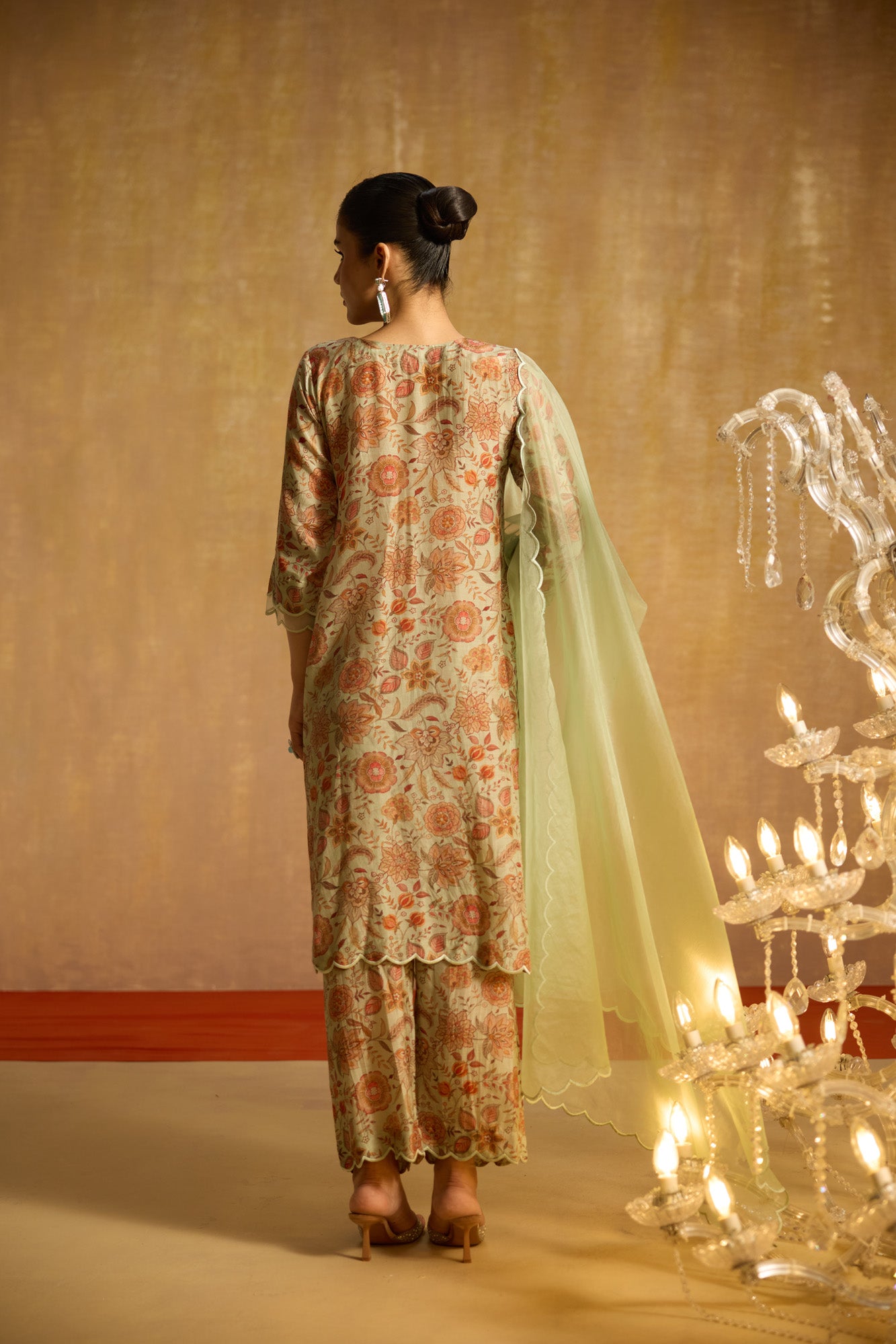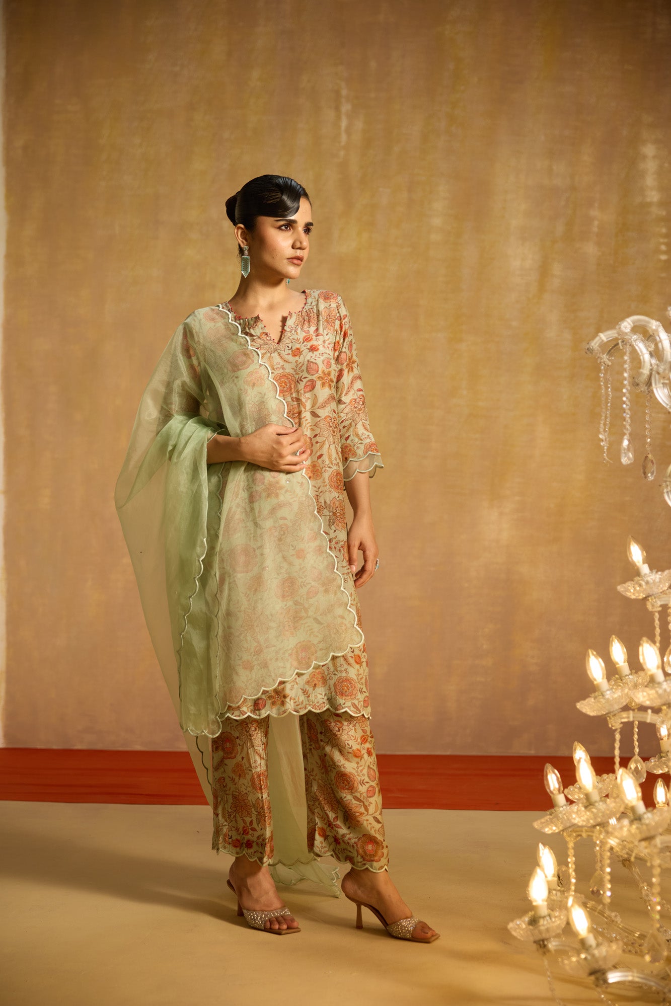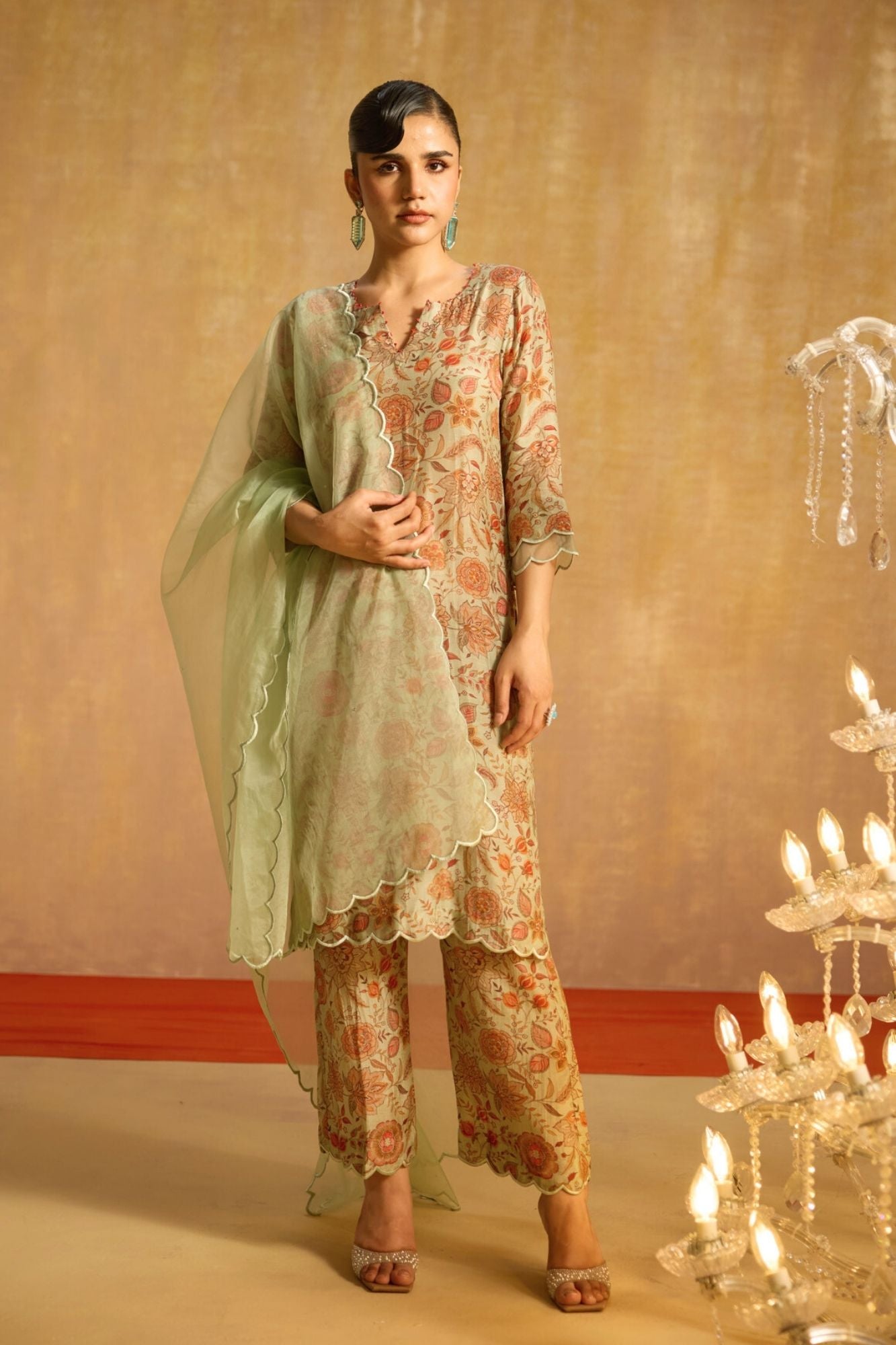 • Completed with a sheer silk dupatta in pastel green, finished with scalloped embroidery, making it a statement ensemble