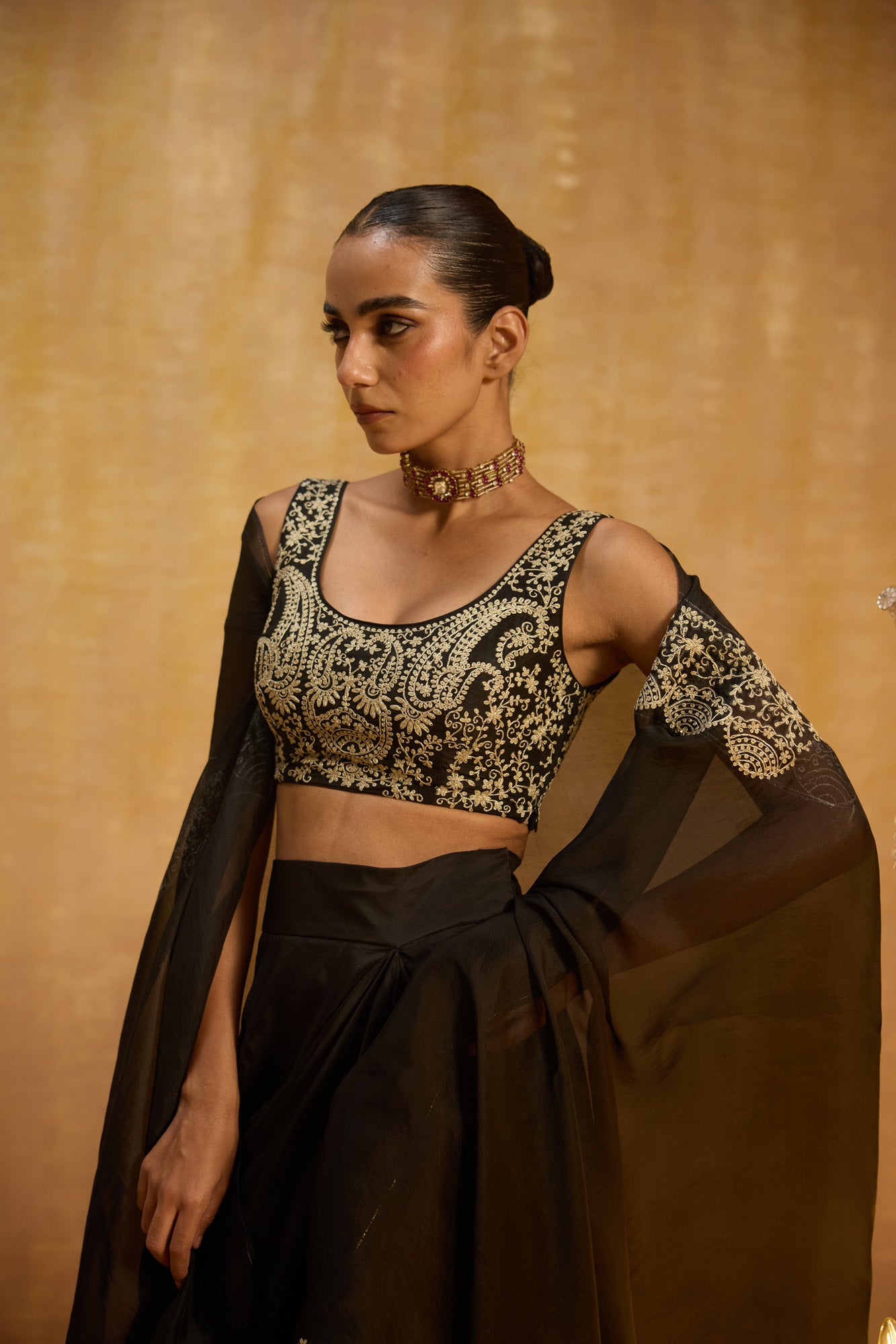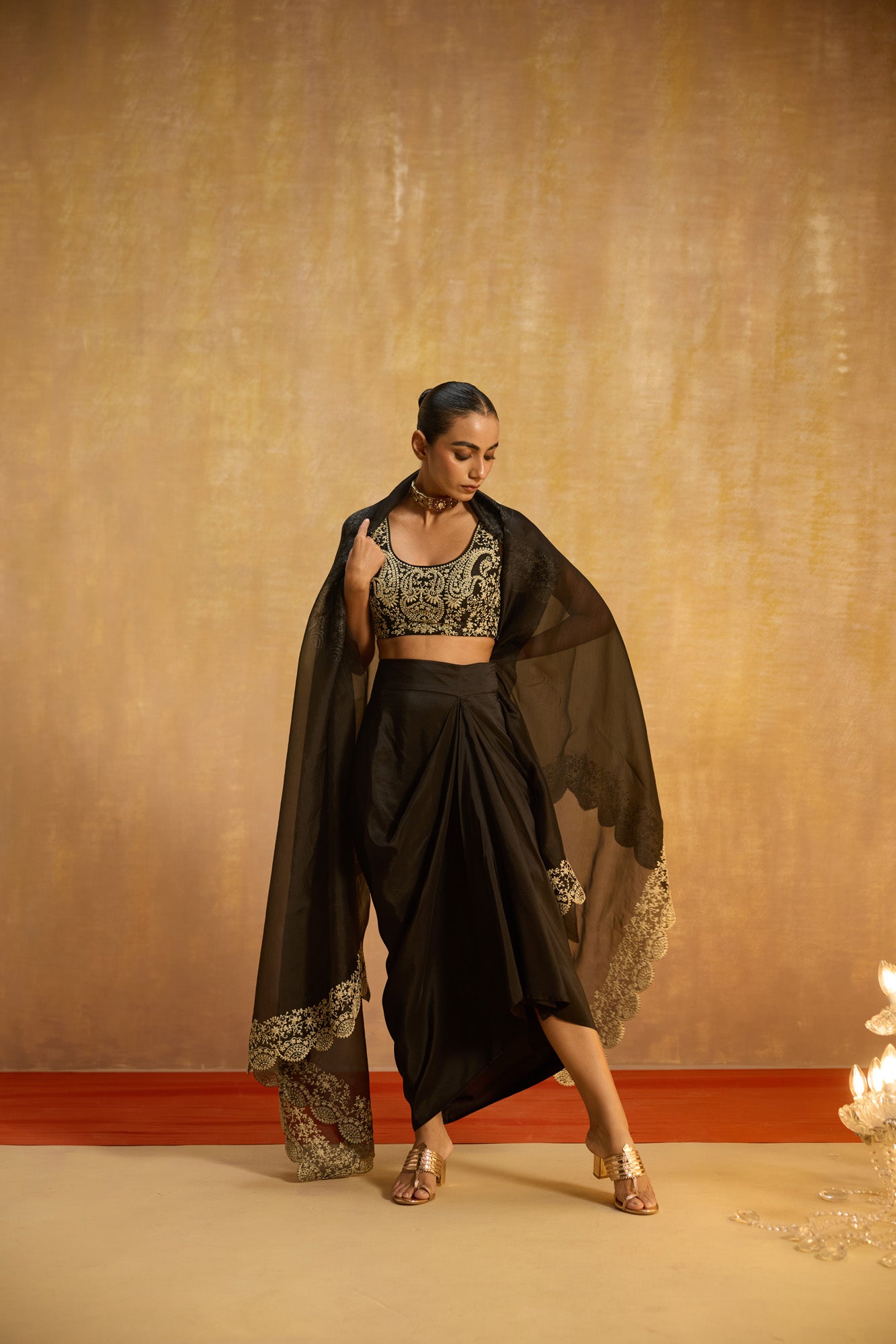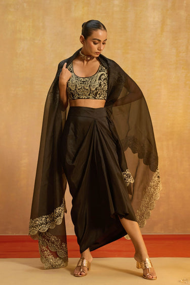 - Highlighted with a matching embroidered cape that adds movement and grandeur to the ensemble