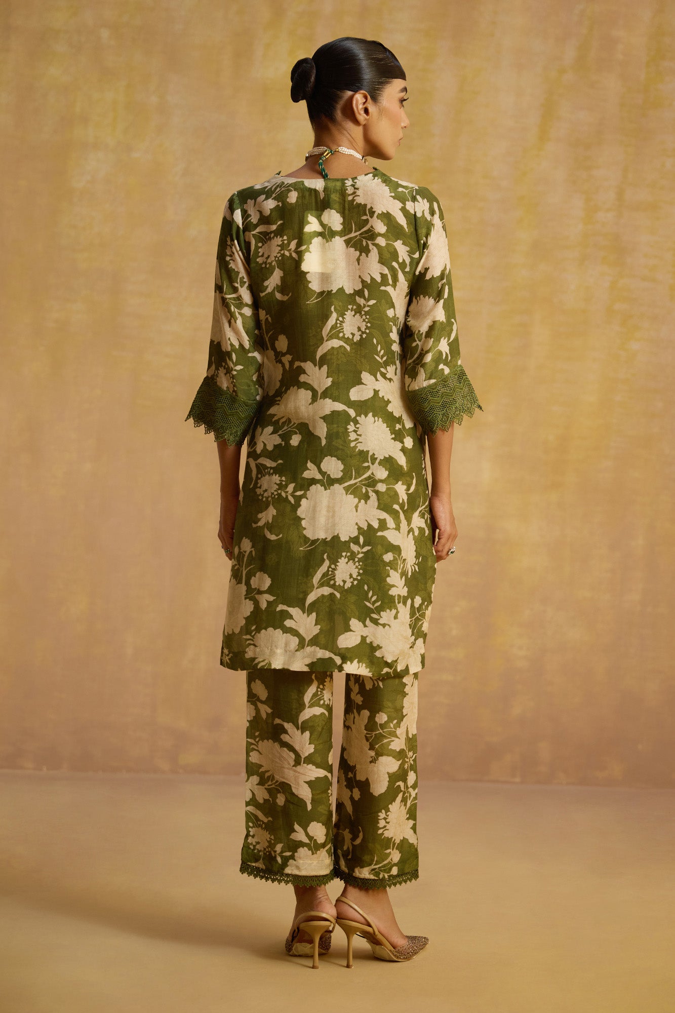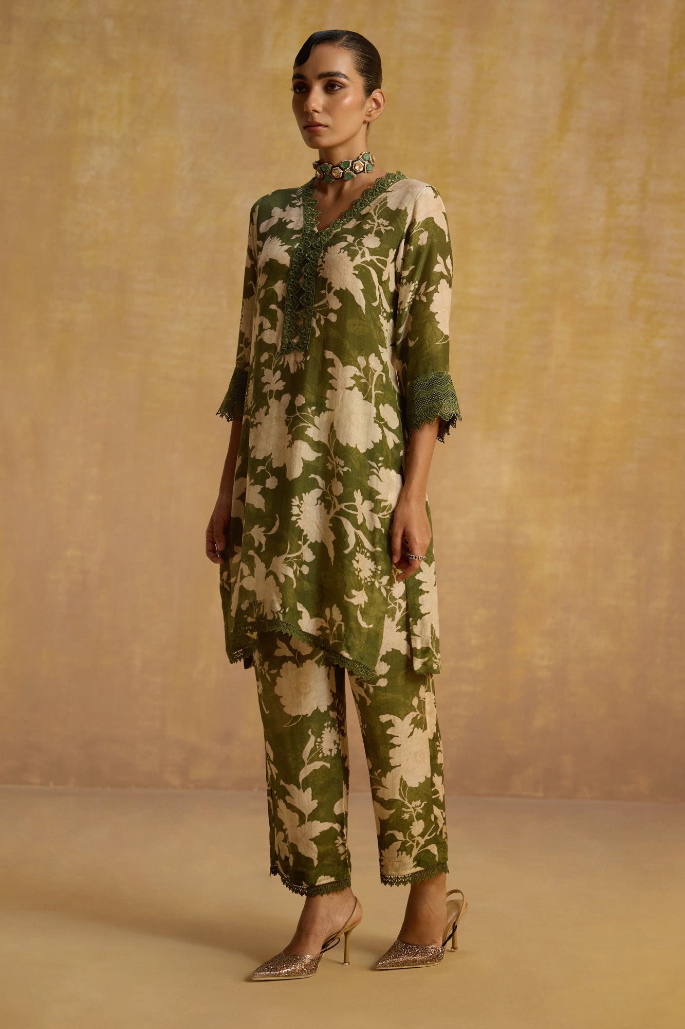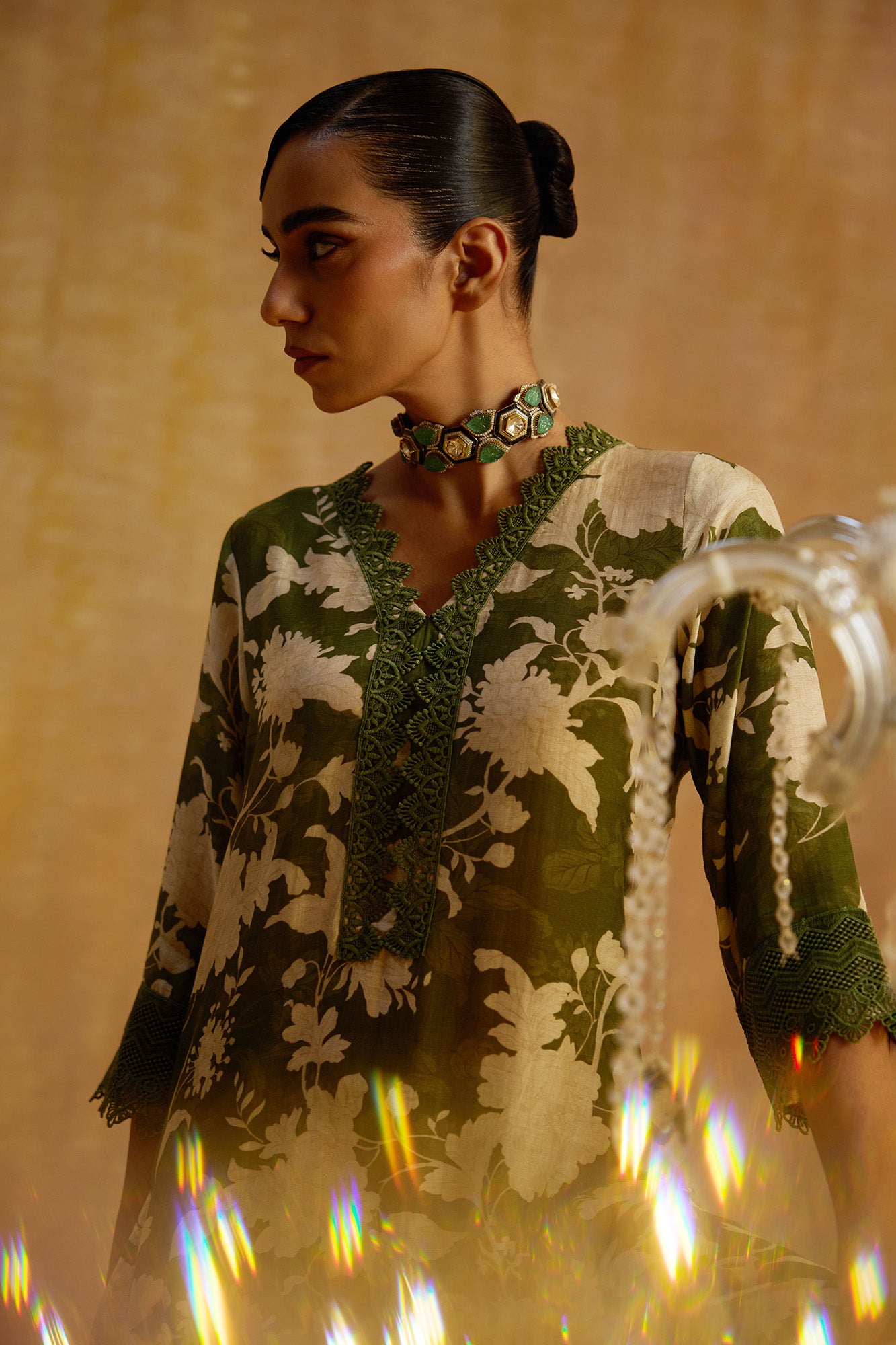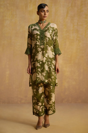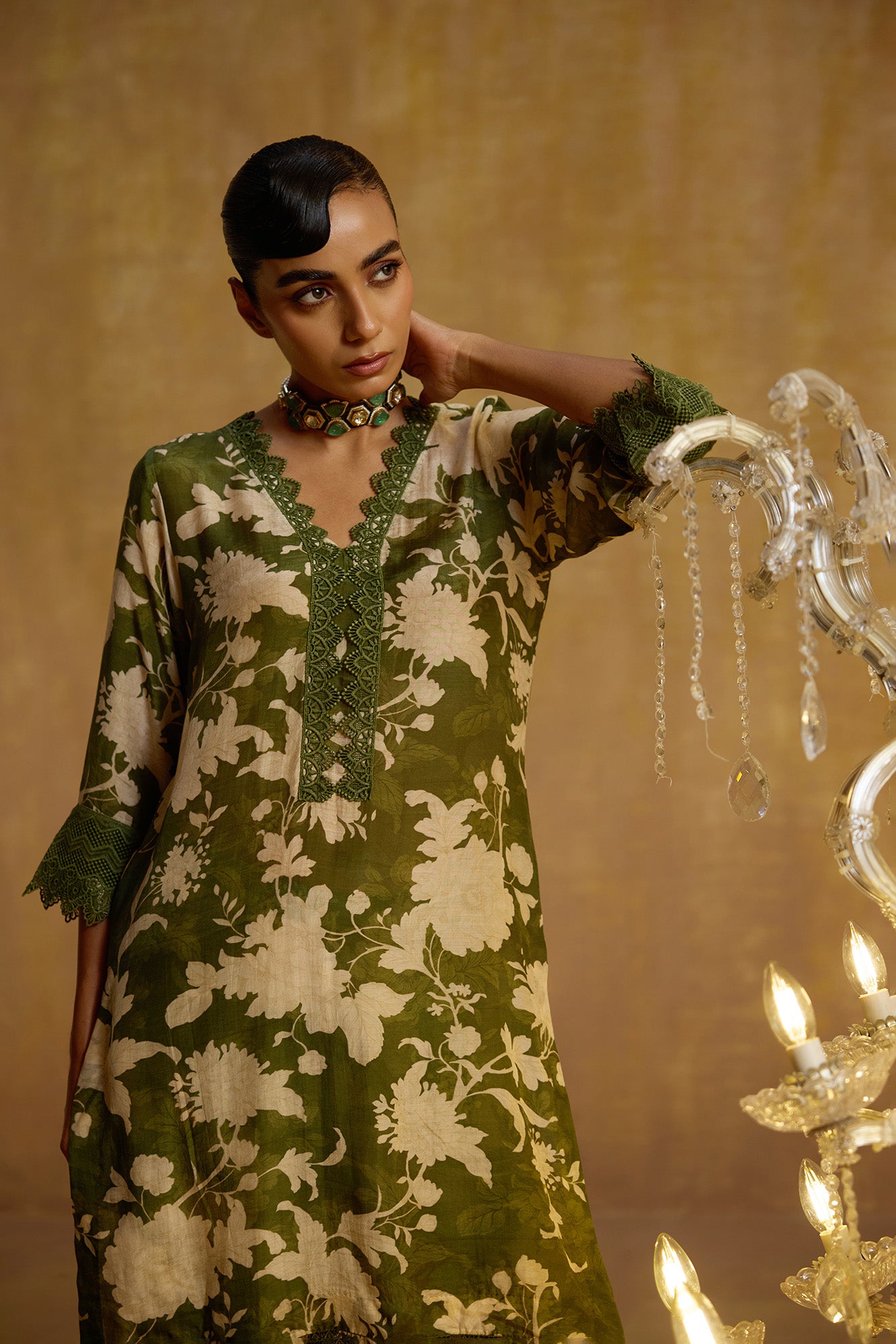- Designed with bold floral print in earthy tones, accented with lace-trimmed neckline, sleeves, and hemline for artisanal detailing