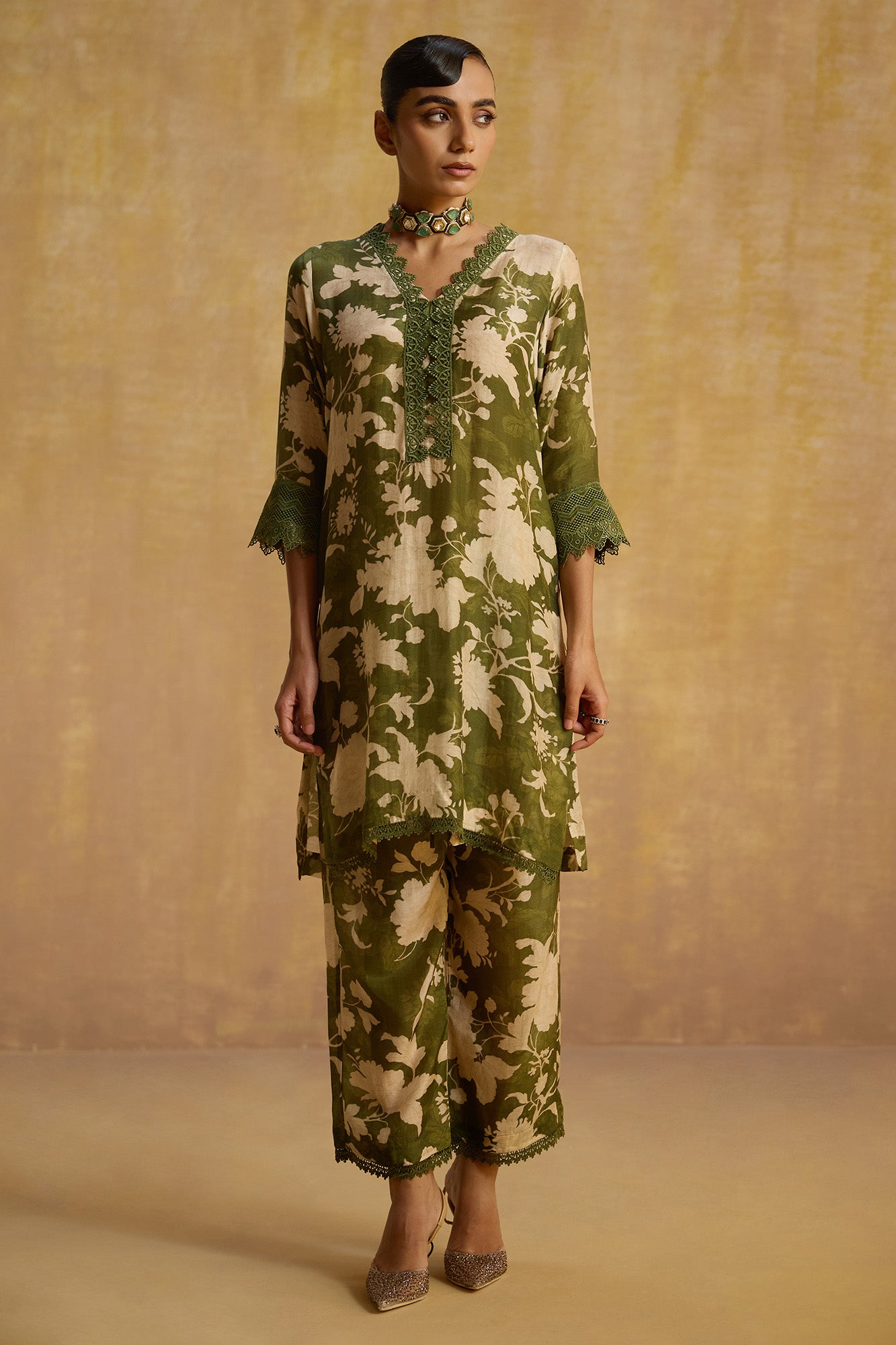 - Paired with straight-fit pants featuring coordinated print and lace finish for a complete look